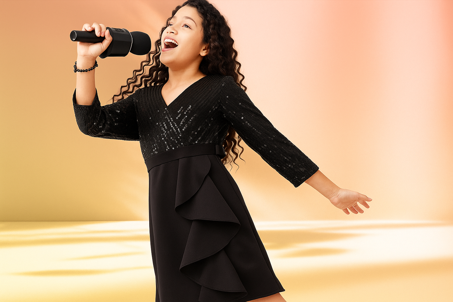 Elevate your performance with the Crazy Fashion Sparkle Ruffle Dress! This stunning red dress features a sparkling upper bodice, elegant ruffle details, and a comfortable fit, perfect for singing or dancing on stage. Paired with a chic bracelet, it’s designed to make you shine. Ideal for young performers looking to stand out with style and flair!
